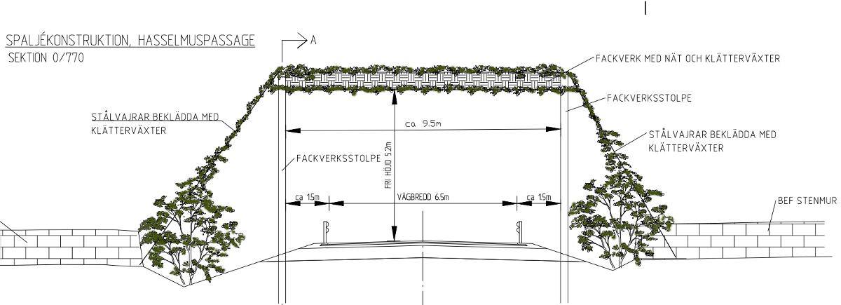 Genom att vajrar kläs med klätterväxter och så småningom blir det en grön portal med bland annat honungsros och björnbär som löper över vägen.