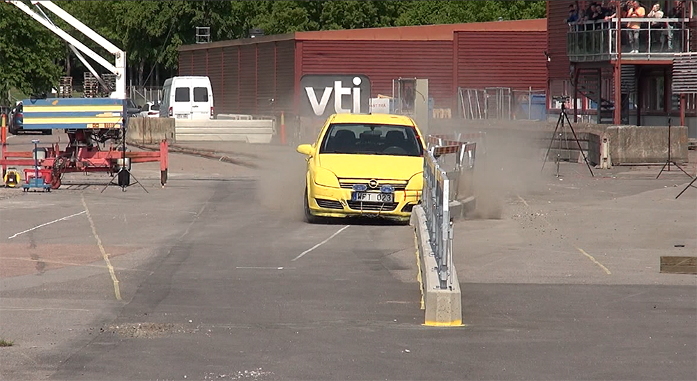 I juni genomfördes ett krocktest av vår slirstock hos VTI, Statens väg- och transportforskningsinstitut i Linköping. T1-testet utföll väl. T1 betyder i klarspråk att en 1300 kg bil kör in i balken i 80 km i timmen i en vinkel på 8 grader.